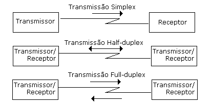 Simplex - Neste caso, as transmissões podem ser feitas apenas num só sentido, de um dispositivo emissor para um ou mais dispositivos receptores; é o que se passa, por exemplo, numa emissão de rádio ou televisão; em redes de computadores, normalmente, as transmissões não são desse tipo.